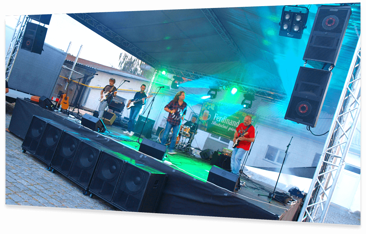 Disponujeme také kompaktními reproboxy na stativech pro malé akce a výkonnými koaxiálními bi-amp odposlechy určenými pro blízký poslech přímo na podiu.